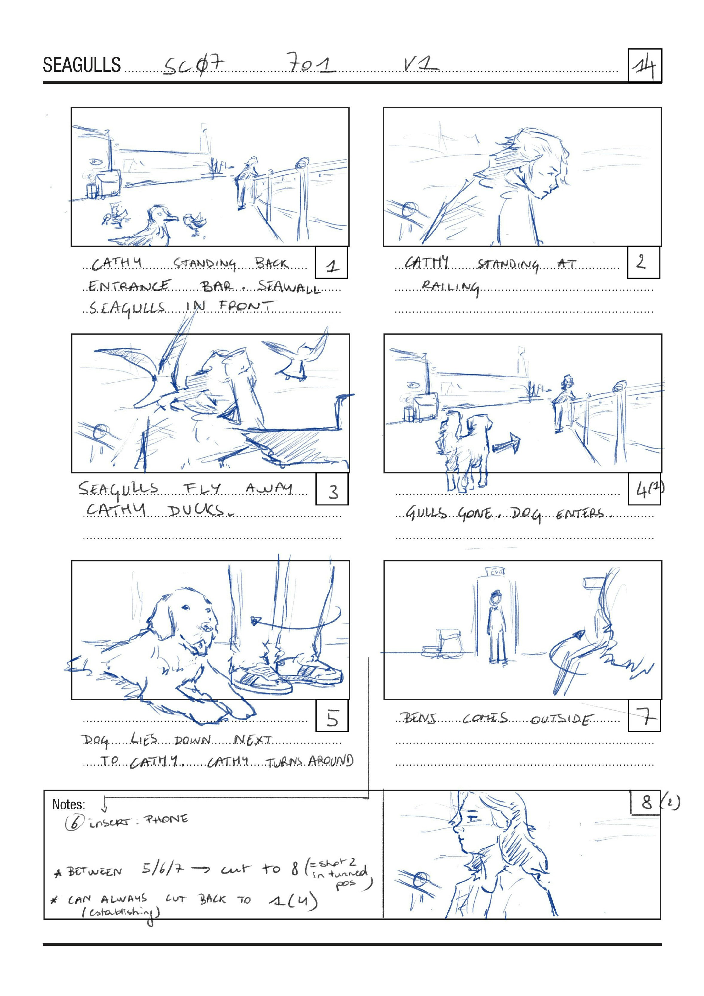 Seagulls storyboard (cover page) & excerpt page from a scene.